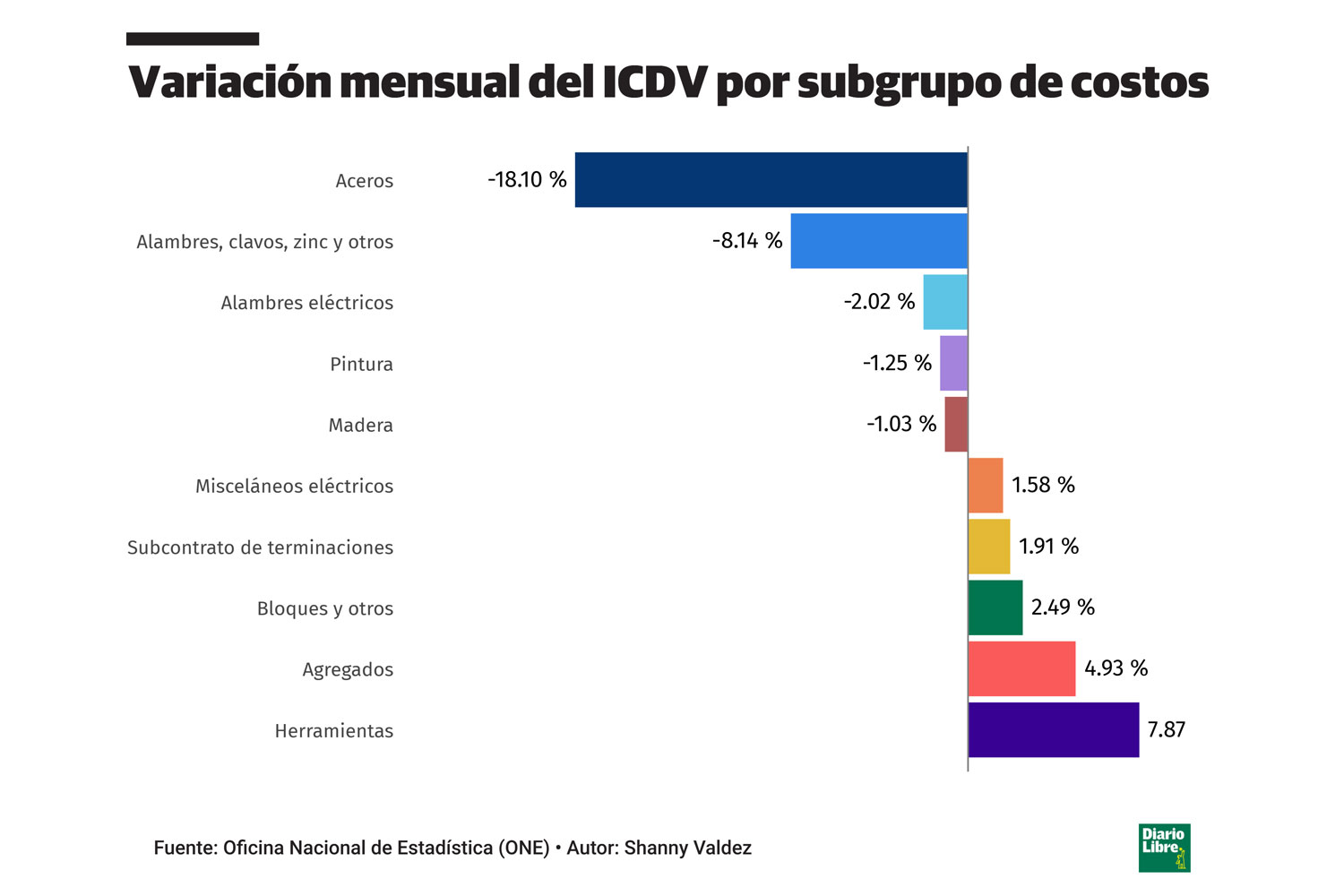 Los aceros (-18.10 %), alambres, clavos, zinc y otros (-8.14 %), alambres eléctricos (-2.02 %), pintura (-1.25 %) y madera (-1.03 %) fueron insumos que, por el contrario, mostraron reducciones en sus costos en noviembre.
