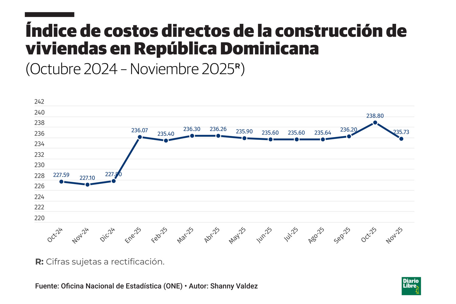 El Índice de Costos Directos para la Construcción de Viviendas (ICDV) –una herramienta que analiza cada mes el costo para realizar una casa, un apartamento o proyectos habitacionales más amplios– se situó en 235.73 en noviembre, para un aumento interanual de 3.74 % con relación al resultado de noviembre pasado, de 227.22.